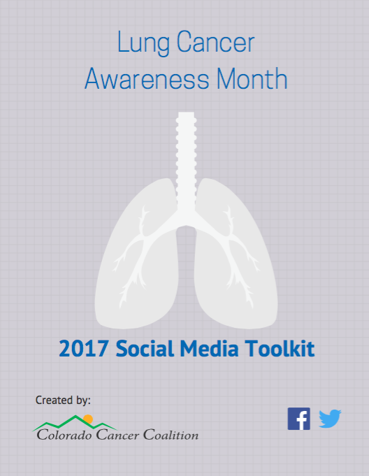 This kit was created to reduce the burden of lung cancer in Colorado through social media awareness and outreach. Lung Cancer is mentioned as a priority in the 2016-2020 Colorado Cancer Plan (www.coloradocancerplan.org). To reduce the burden of lung cancer in Colorado we aim to educate on risk factors, cancer screenings, and share support groups for patients, survivors, and their family members. We hope you use this guide to help spread awareness of lung cancer during the month of November and throughout the year.