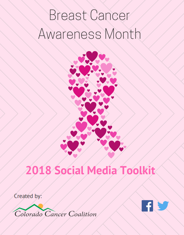 This kit was created to reduce the burden of breast cancer in Colorado through social media awareness and outreach. The Colorado Department of Public Health and Environment has released a state cancer plan (www.coloradocancerplan.org) to reduce the incidence and mortality of cancer in Colorado by identifying state trends in risk factors, cancer prevalence and mortality.This burden can be reduced through education on risk factors, cancer screenings, and by providing support for patients, survivors, and their family members. We hope you use this guide to help spread awareness of breast cancer during the month of October and throughout the year.